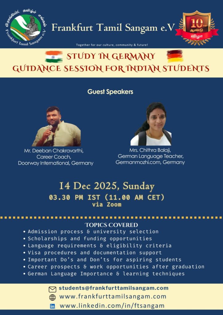 பிராங்பேர்ட் தமிழ்ச் சங்கம் இந்தியாவைச் சேர்ந்த மாணவர்களுக்காக “ஜெர்மனியில் உயர்கல்வி” குறித்த வழிகாட்டல் நிகழ்ச்சியை வெற்றிகரமாக நடத்தியது.